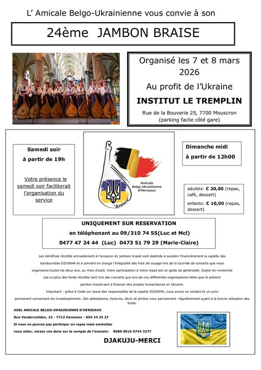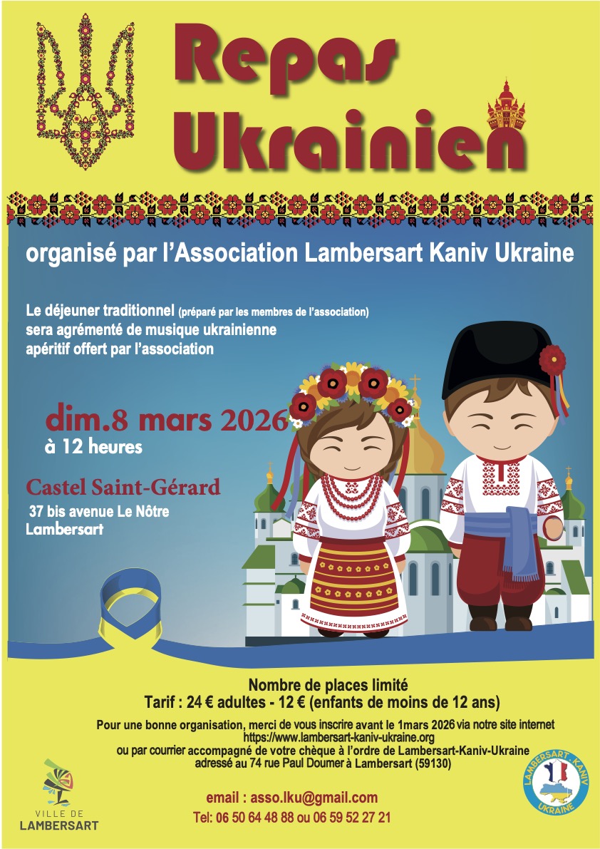Toute l’équipe du conseil d’administration de Lambersart Kaniv Ukraine associée aux nombreuses bonnes volontés qui nous aident pour ce formidable challenge de solidarité que constitue le repas ukrainien, vous invitent le dimanche 8 mars prochain pour son édition 2026 :