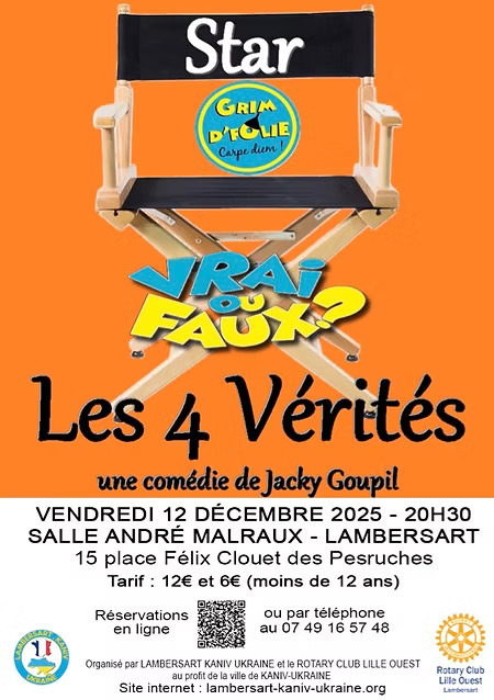 Vous pouvez dès à présent réserver vos places pour la représentation de la pièce de théâtre « Les 4 vérités » qui est prévue le 12 décembre 2025 à 20h30. C’est une comédie de Jacky Goupil jouée par la troupe de grande qualité « Grim d’folie », qui s’est déjà produite en 2024 pour nous.